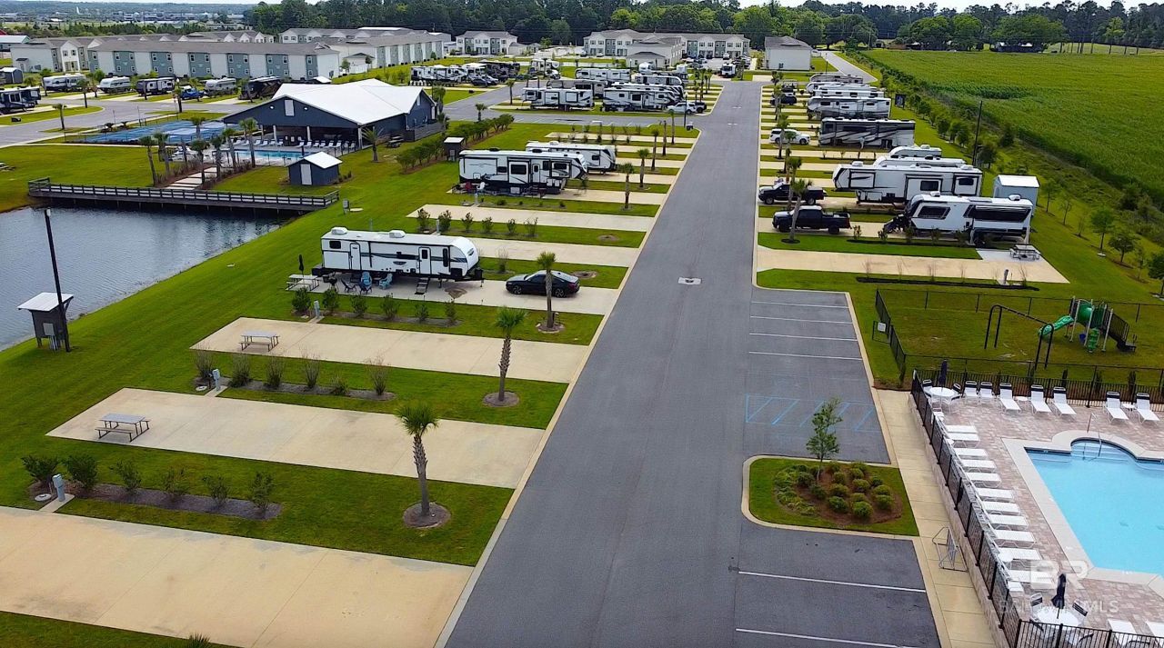 This lot is located just north of bath house #3 and pool, playground and dog park. It backs up against the water's edge for a fantastic view. Utilities are on a single pedestal hook-up for convenance of RV install. Ride your bike or take a short walk to reach everything in Foley's entertainment district! Park amenities include a community clubhouse with a large pavilion, heated pool, lake pier, fully equipped kitchen, picnic tables, 2 large screen TVs, and bathrooms with showers. Other amenities include 2 additional bath houses with pools, dog park,playground, and 3 pickleball courts. Increasing the value of your lot by adding a gazebo, storage building or pavilion. You also have theoption of renting your lot. A rental assistance program is also available. HOA dues are $235 month which covers your water, sewer, trash, landscaping cable, Wi-Fi and access to all park amenities. RV shown is not included in sale of lot. Buyer to verify all information during due diligence.
